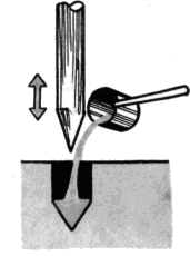 Ямы для столбов удобно делать с помощью остро заточенного куска трубы, приваренного к составной (из нескольких звеньев) ручке. Трубу забивают в землю кувалдой или бабой, а затем вынимают, многократно повторяя эту операцию. Для удаления грунта в трубе сверлят 3 отверстия. В них вставляют металлический стержень и действуют им как рычагом.