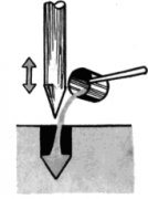Чтобы установить небольшой столб (диаметром 10—12 см) для изгороди, не обязательно рыть яму. Нужно снять дерн, а затем взять заостренный столб руками, начать как таран вбивать его в землю, непрерывно подливая воду в образовавшуюся лунку. В глинистую почву на глубину 50 см столб войдет в считанные минуты. Издержки метода — брызги, которыми будут залиты тот, кто забивает, и тот, кто подливает воду.