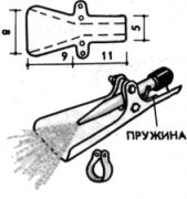 Можно самому сделать дождевальный разбрызгиватель для поливки. Изготавливается он из 2 мм алюминия по выкройке, приведенной на рисунке (размеры даны в см). На наконечник шланга надевают хомутик, к нему общим болтом шарнирно крепится разбрызгиватель. Второй болт служит осью пружины. Сжатием ее регулируются ширина и дальность разбрызгивания.