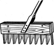 Для собирания на садовом участке опавших листьев можно сделать грабельки из рифленой листовой резины (200x150x5 мм). Этот инструмент позволяет собирать листья, не повреждая растений. Зубья длиной 60—70 мм располагаются вдоль рифлей: резина зажимается между двух сбитых гвоздями легких досок; ручка устанавливается с наклоном 20—25° в плоскости резины. Для изготовления грабелек можно использовать и гладкую резину.