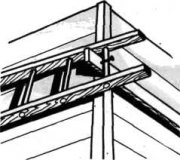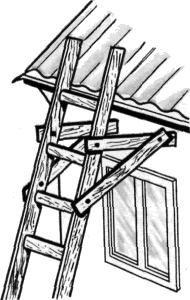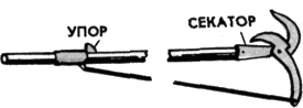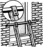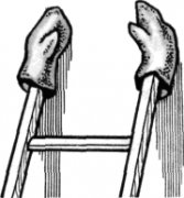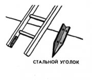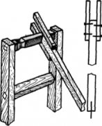 Две такие подпорки под лестницу превращают ее в стремянку, весьма удобную для работы в саду. На верхней перекладине лестницы места ее соединения с подпорками слегка скруглите с тем, чтобы вилки подпорок плотно входили в свои гнезда, позволяя при этом устанавливать подпорки под любым углом к лестнице и вместе с тем препятствовать передвижению вилки подпорки по самой перекладине. В ножки лестницы и подпорок вбейте по достаточно большому гвоздю.