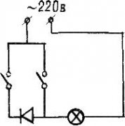 Лампочки дежурного освещения перегорают очень быстро — ночью напряжение повышенное. Чтобы иметь возможность включить их на ночь вполнакала, достаточно установить двойной выключатель и в его корпусе смонтировать полупроводниковый диод типа Д226. В одном положении выключателя лампочка горит на полную мощность, в другом — в половинную.