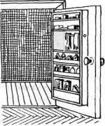 Во многих современных домах площадь стен в ванных комнатах явно недостаточна, чтобы можно было разместить на них нужное количество полок для необходимых в быту мелочей. В легком навесном шкафчике на двери ванной комнаты удобно укрепить зеркало, а под ним на полочках расположить бритвенные принадлежности, предметы туалета. Нижние полочки можно использовать для хранения стиральных порошков и различных жидких моющих средств. Чтобы при открывании и закрывании двери предметы не падали, полочки снабдите бортиками и специальными рейками-ограничителями. Если захотите, шкафчик можно снабдить раздвижными дверцами. Все детали шкафчика тщательно обработайте шкуркой и окрасьте под цвет двери.