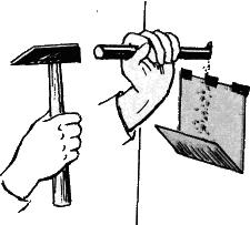 Когда стенка, на которой нужно что-либо закрепить, настолько тонка, что ни гвоздь, ни шуруп не держатся в ней, а крепление при помощи обычного болта с гайкой нельзя применить из-за того, что с противоположной стороны нечем придержать гайку, можно использовать внутреннюю, зажимную шайбу. Ее форма видна на рисунке. Изготовить ее можно из жести или алюминия. Применяя этот способ крепления, нужно быть точным в определении размера и формы отверстия в стене. Его лучше делать прямоугольным, но можно и круглым.