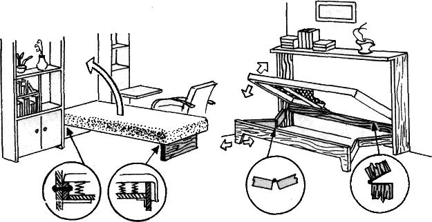 Откидная мебель в квартире весьма удобна. Она облегчает уборку комнаты, экономит место. Вот варианты по конструкции откидных кроватей. Вы, скажем, можете использовать стандартный пружинный матрас, снабдив его откидными ножками, а другому лучше подойдет деревянная рама с сеткой из резиновых лент и накладным поролоновым матрасом. Один будет устанавливать конструкцию в углу комнаты, и ему понадобятся только одна откидная ножка и штырь, забитый в стену. Другой — в центре стены. И ножек понадобится две. Однако во всех случаях откид ная койка должна крепиться не непосредственно к стене, а через брус, который намертво прибивается к стене.