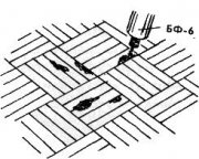 Как восстановить лаковое покрытие паркетного пола? Вначале почерневшие участки паркета, с которых сошел лак, зачищают крупной наждачной бумагой до светлой древесины. Затем эти и прилегающие места протирают тампоном (обернутая тканью вата), смоченным ацетоном. Ацетон растворяет мелкие частицы лака. На чистую древесину наносят клей БФ-6 и снова протирают тем же тампоном. После высыхания паркет покрывают любым лаком для пола.