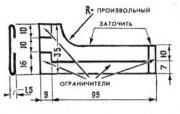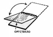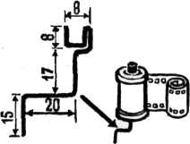Фотолюбители хорошо знают, как трудно в темноте оборвать или обрезать конец рулонной фотопленки для того, чтобы можно было ее зарядить в катушку. А выход из положения прост. Сделайте из жести от консервной банки такой шаблон. Устройство его предельно ясно. Для того чтобы пленка не «выскочила» из шаблона, а надежно уперлась в ограничители, жесть в местах сгиба слегка приплюсните молотком. На снимках вы видите «зарядку» шаблона пленкой и процесс «обрезки» — обрывание пленки по контуру шаблона.