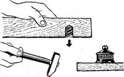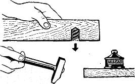 Вот небольшая коллекция истин, которые, может быть, еще не стали азбучными для малоопытных любителей мастерить из дерева. Вверху слева показано правильное расположение клина, а справа — неправильное. Ниже — соответственно правильное и неправильно заготовленная прорезь для рукоятки киянки. Внизу слева—правильно заготовленная верхушка кола, а справа — неправильная. Если вы не снимете фаску, то при забивании кола в грунт его верхняя часть обязательно «размочалится».