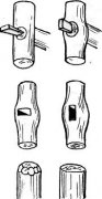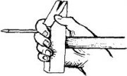 Вот небольшая коллекция истин, которые, может быть, еще не стали азбучными для малоопытных любителей мастерить из дерева. Вверху слева показано правильное расположение клина, а справа — неправильное. Ниже — соответственно правильное и неправильно заготовленная прорезь для рукоятки киянки. Внизу слева—правильно заготовленная верхушка кола, а справа — неправильная. Если вы не снимете фаску, то при забивании кола в грунт его верхняя часть обязательно «размочалится».