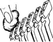 Не огорчайтесь, если в разгар работы с буквенного рычага вашей пишущей машинки отскочила колодочка с литерой, а паяльника под руками не оказалось. Соскоблив острым ножом с рычага олово, оставшееся от пайки, положите на очищенное место кусочек ваты, пропитанной клеем БФ-2, и, ке дожидаясь, пока клей подсохнет, поставьте отскочившую колодочку на место. Если она идет в гнездо чересчур туго, положите сверху на литеру деревянный брусочек и плоскогубцами осторожно прижмите колодочку к гнезду. Затем зажгите спичку и хорошенько прогрейте колодочку с литерой. При этом сгорят излишки ваты и клея, а колодочка с литерой намертво приварится к буквенному рычагу.