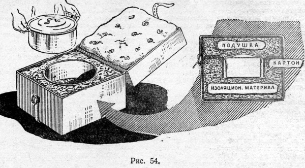 После этого останется сделать крышку. Она может быть или съемной, или но петлях и должна плотно прижимать подушку, которая, в свою очередь, будет надавливать па. крышки кастрюль. Сверху положите какую-нибудь тяжесть или притяните крышку ремнем с пряжкой (рис. 54)