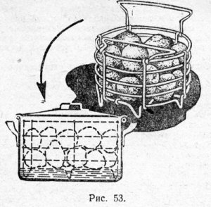 Варка паром осуществляется так. На дно посуды ставят сетчатую проволочную подставку на ножках (рис. 53) или к краям кастрюли прикрепляют специальную сетку. То и другое можно при необходимости заменить дуршлагом. На него кладут предназначенную для варки рыбу, котлеты, картофель и т. п., а посуду плотно закрывают крышкой.