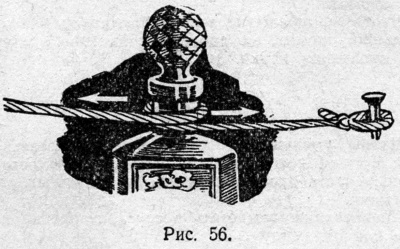Возьмите прочный шнурок и привяжите один его конец к ножке тяжелого стола, дверной ручке я т. п. Охватите горлышко бутылки свободной петлей и, держа другой конец шнура в левой руке, быстро двигайте бутылку по шнуру взад и вперед (рис. 56). От трения о шнурок стекло бутылки нагреется и расширится, а пробка останется холодной (первоначального размера), и ее без труда можно будет вынуть. Нужно это делать быстро, чтобы стекло бутылки не успело остыть.