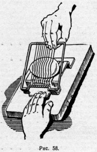 Нарезать крутое яйцо для салата или бутербродов не всегда легко. Для разрезывания яйца на аккуратные ровные дольки очень удобно применять приспособление, состоящее из проволочных нитей (рис. 58).