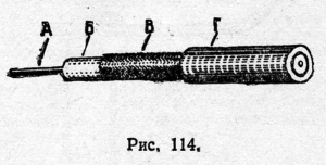 Крепление кабеля к плечам наружной антенны. Коаксиальный кабель, используемый для устройства фидера наружной антенны, показан на рисунке 114. В центре кабеля проходит медная жила А, окруженная пластичным изоляционным материалом Б, поверх которого надета оплетка В из тонких медных проводов. Эта оплетка, в свою очередь, заключена в хлорвиниловую оболочку Г.