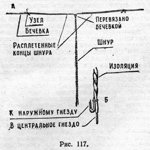 Нерасплетенный конец шнура нужно подвести к антенному входу телевизора. Если имеется лишний антенный штеккер, то его следует использовать для включения антенны, так как присоединение антенны при помощи штеккера удобно и надежно. В случае необходимости можно обойтись и без штеккера. Концы шнура надо освободить от изоляции на длину около 5—6 мм и перевязать оплетку, чтобы она не сползала. Один из концов шнура изгибают так, как показано на рисунке 117(6). Жилки другого, прямого, конца нужно скрутить в жгутик и этот конец вставить в центральную часть антенного гнезда (входа) телевизора. Изогнутый конец своими зачищенными жилками, также свитыми в жгутик, должен касаться наружной (боковой) стенки антенного входа. Антенну подвешивают к стенам комнаты.