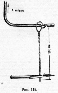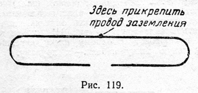 3. Заземление петлевой антенны. Наружная петлевая антенна обычно заземляется при ее установке. Заземляется «нулевая точка» этой антенны, находящаяся точно посредине ее горизонтальной части. Эта точка показана на рисунке 119. Заземление нулевой точки не сказывается на работе антенны, и поэтому антенна может оставаться постоянно заземленний.