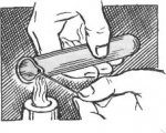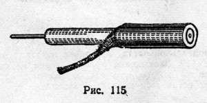 С того конца кабеля, который будет прикреплен к антенне, нужно удалить часть хлорвиниловой изоляции. Обнажившуюся металлическую оплетку расплетают (напр., концом шила) и отделяют ее от внутреннего пластичного изоляционного материала. Эту часть оплетки надо закрутить в виде жгутика (рис. 115), конец которого припаивают к одному плечу антенны, а центральную жилу кабеля — к другому. Для припайки пользуются оловом (или припоем) с канифолью.
