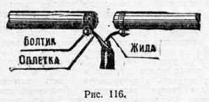 Если для устройства антенны применены алюминиевые трубы, то кабель к ним не припаивается, а прикрепляется при помощи стяжных металлических хомутиков. Места труб, где должны быть прикреплены жила кабеля и его оплетка, нужно зачистить до блеска ножом или шкуркой. На зачищенное место надевают хомутик, который стягивается болтиком с гайкой. Жила кабеля и свитая в жгутик оплетка поджимаются под болтик туго завинчиваемой гайкой (рис. 116). Для надежности крепление жилы и оплетки к хомутикам следует пропаять оловом с канифолью.