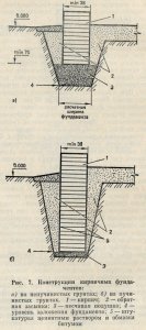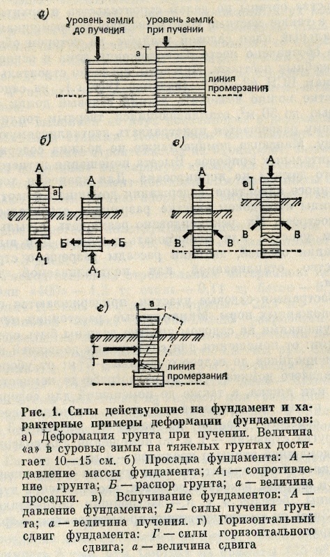 На фундамент нередко воздействуют также силы бокового пучения Г (рис. 1,г). Уменьшить их влияние можно, если фундамент в поперечном сечении сделать со скосом, обмазать его битумом, утеплить отмостки и провести другие мероприятия, снижающие глубину промерзания основания. В тех случаях, когда фундамент сооружают в виде столбов или свай, следует иметь в виду, что на конструкцию воздействует также сила сдвига Г. Противостоять этим силам может фундамент с достаточной продольной жесткостью.