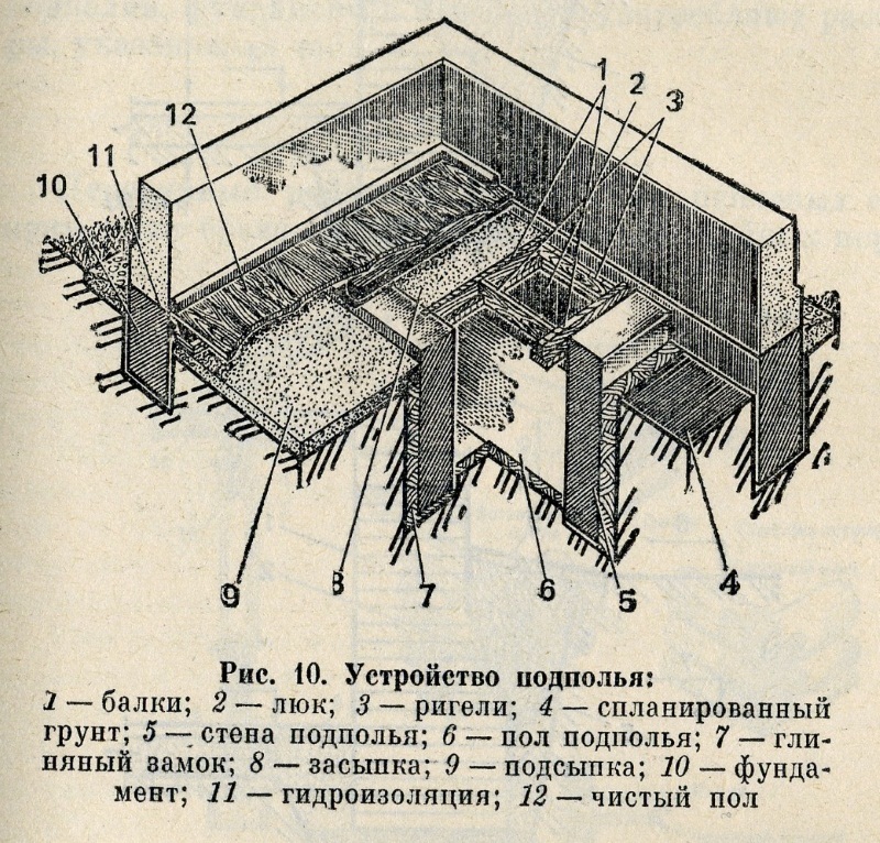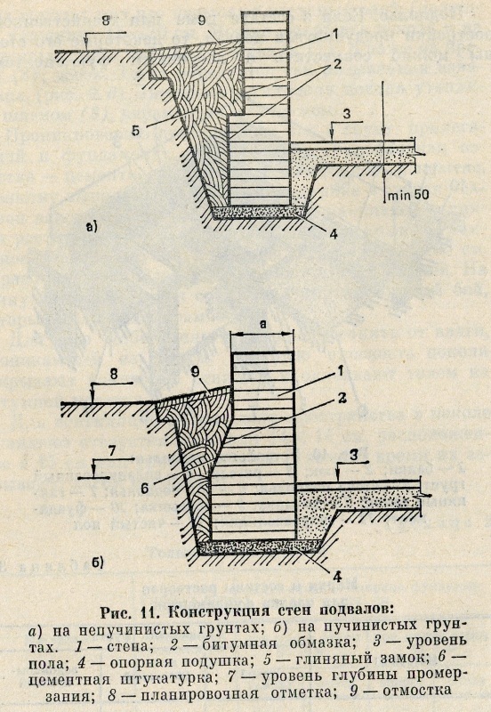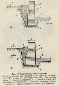 Ограждающие конструкции подполья (рис. 11) можно выкладывать из бута или бутобетона. При сухих грунтах стены выкладывают из керамического кирпича, а в лесных районах для возведения стен подполья используют древесину в виде бревен или пластин.