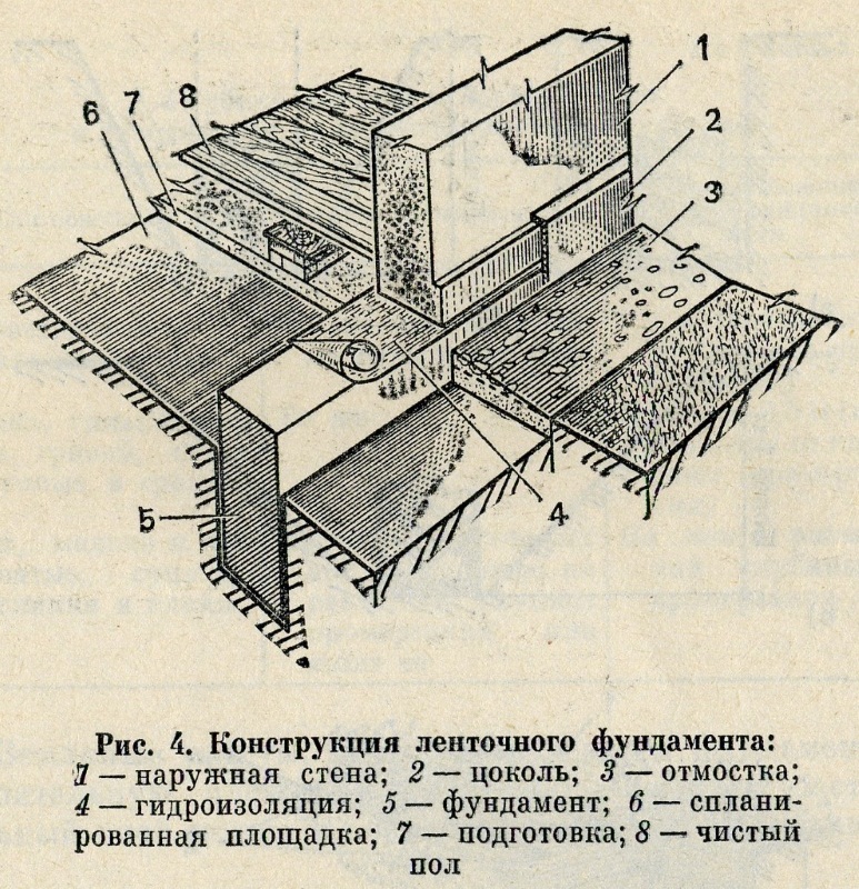 Ширина ленточного фундамента (рис. 4) должна быть не меньше толщины будущей стены. Если его сооружают из рваного бута, то ширину фундамента принимают около 0,5 м.