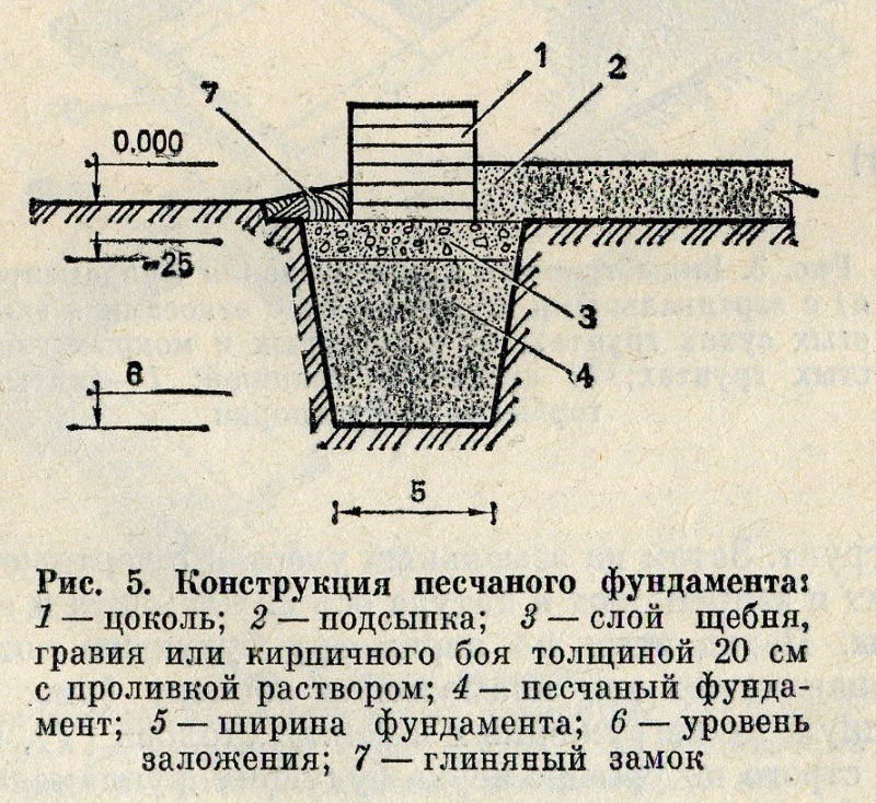 Наиболее экономичны фундаменты из крупнозернистого песка (рис. 5). Их устраивают под небольшие одноэтажные здания на непучнистых грунтах с низким уровнем стояния подпочвенных вод, ниже на 0,5—1 м уровня заложения фундамента (6) и хорошим поверхностным водоотводом. Фундамент делают следующим образом: песок (4) укладывают слоями по 15—20 см, проливая каждый из них водой. Верх песчаного фундамента (не доходя 25—30 см до планировочной отметки) выполняют из щебня (3), гравия или кирпичного боя на растворе с послойным трамбованием. Затем выкладывают цоколь стены (1), глиняный замок (7), подсыпку (2).