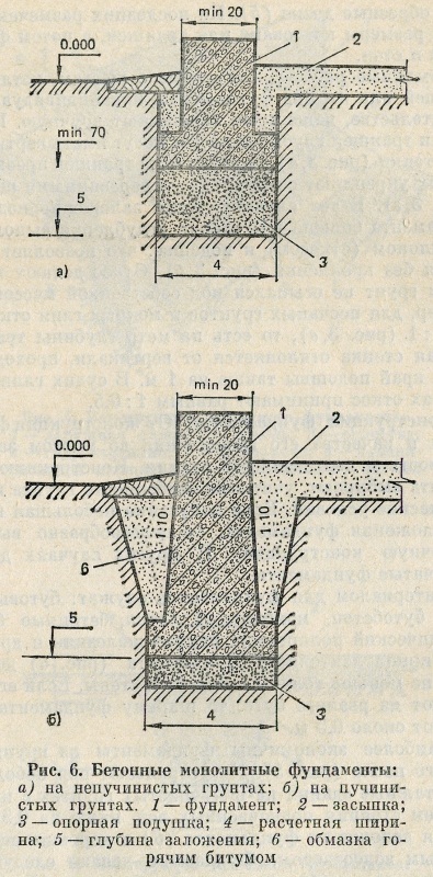 Основание фундамента. Основанием, на которое опирается фундамент здания, является грунт. Он должен быть достаточно прочным и иметь незначительную сжимаемость и пучинистость. Такими свойствами обладают далеко не все грунты. Например, торфяные грунты сильно сжимаются под нагрузкой, глинистые — нередко пучинятся (разбухают). Строительство домов на таких грунтах требует проведения различного рода мероприятий, связанных с осушением застраиваемой территории, заменой негодного грунта привозными материалами и т. п. Лесовидпые грунты при насыщении водой оседают под действием массы строения, вызывая нарушение его конструкций. Перед началом строительства на таких грунтах принимают меры, предотвращающие увлажнение основания.