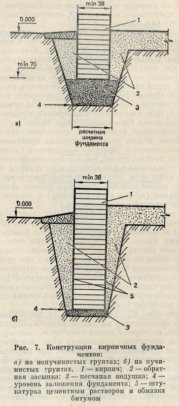 Кирпичные фундаменты (рис. 7) выкладывают из хорошо обожженного глиняного кирпича. Кирпич, как известно, подвержен воздействию воды, поэтому долговечность кирпичного фундамента ниже, чем бутобетонного или бетонного. Следовательно, при высоком стоянии грунтовых вод и большой глубине заложения применять кирпичные фундаменты не рекомендуется.