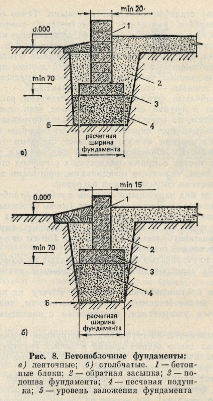 В современном строительстве широко используют сборные бетонные блоки. Их можно приобрести в магазинах строительных материалов, но легко изготовить и самим. Для этого из досок сбивают деревянную опалубку, которую затем заполняют бетонной смесью. Масса блоков не должна превышать 50 кг. Через 3—4 дня опалубку разбирают, а блоки оставляют на месте бетонирования, с тем чтобы они со временем (летом — через 21 день) стали максимально прочными. Такие бетонные изделия пригодны для устройства ленточных (рис. 8, а) и столбчатых (рис. 8,6) фундаментов на любых основаниях и для всех типов садовых зданий. Вместе с тем следует учитывать, что ленточные фундаменты, выполненные из блоков, обходятся дороже других типов подземных конструкций. Наименее трудоемки и самые дешевые — столбчатые фундаменты.