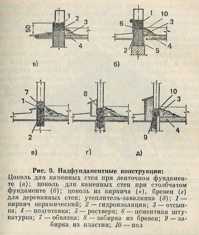 Надфундаментные конструкции. Возвышение фундамента над уровнем земли до уровня пола первого этажа называют цоколем (рис. 9). Он должен быть прочным, долговечным и устойчивым к воздействию грунтовых и атмосферных вод.