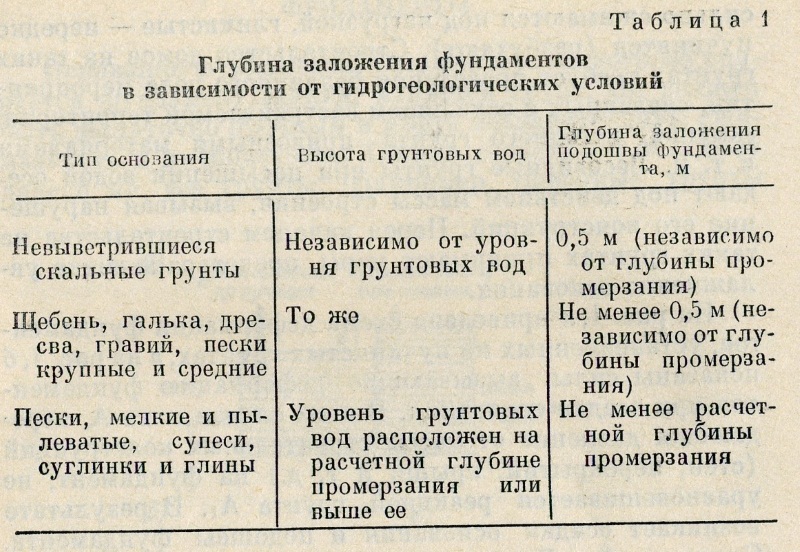 Глубину заложения фундаментов для различных оснований с учетом местных условий можно выбрать по таблице 1.