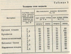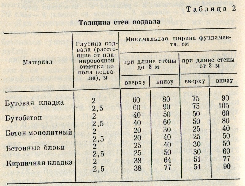 Подполье. Если в составе дома или хозяйственной постройки предусмотрен подвал, то некоторые его стены можно совместить с ленточным фундаментом (рис. 10). В этом случае фундамент наружных и внутренних стен дома, а также фундамент печи заглубляют на всю глубину промерзания грунта. Толщина стен подвала зависит от применяемого материала, высоты и длины помещения (см. табл. 2). Пол подвала не должен размещаться ниже уровня грунтовых вод.