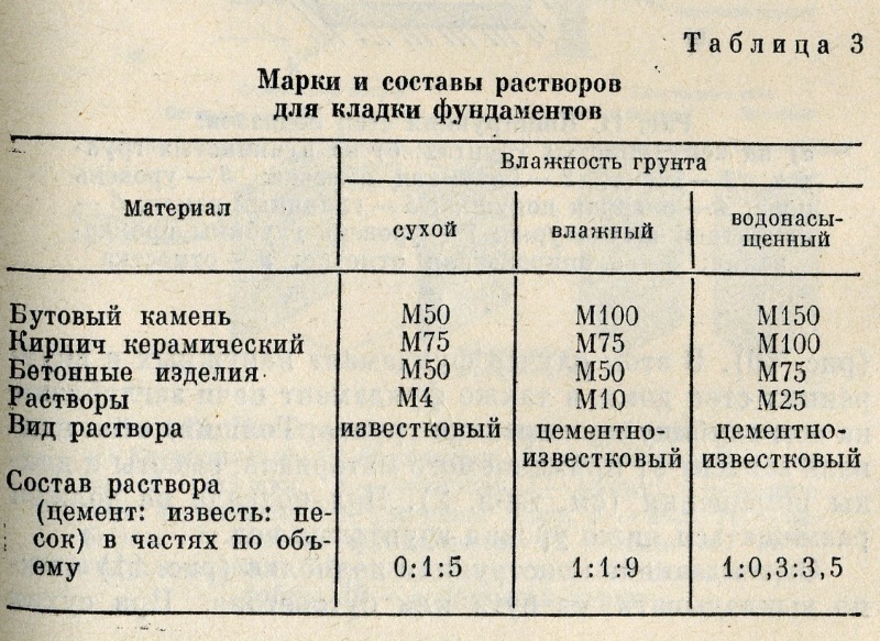 В зависимости от влажности грунта для кладки стен подполий, фундаментов и цоколей употребляют растворы, указанные в табл. 3.