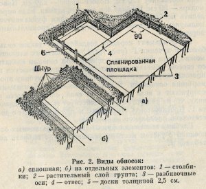 Земляные работы. Перед сооружением фундамента строительную площадку расчищают, снимают растительный слой почвы в пределах застройки, выравнивают грунт. Затем на земельный участок с чертежей переносят и закрепляют в натуре оси фундамента и его размеры. Перед этим по периметру будущего котлована устанавливают так называемую обноску (рис. 2), состоящую из погруженных в землю столбов (1), к которым строго но уровню верха будущего фундамента прибиты обрезные доски (5). На последних размечают оси (3) и размеры котлована или траншеи, а потом фундамента и стен.