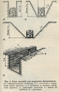Земляные работы, связанные с рытьем котлована, траншей или ям под фундаменты при индивидуальном строительстве, чаще всего выполняют вручную. Котлованы и траншеи глубиной до 1 м могут иметь вертикальные стенки (рис. 3, а). Если глубина траншей превышает 1 м, их укрепляют специальными деревянными щитами (рис. 3, г). В тех случаях, когда заложение подошвы фундамента больше 1 м, стенки углубления выполняют с наклоном (откосом) к подошве, что позволяет обходиться без креплений (рис. 3,6). Откос делают таким, чтобы грунт не осыпался под собственной массой. Например, для песчаных грунтов и мокрых глин откос равен 1 : 1 (рис. 3, в), то есть на метр глубины траншеи каждая стенка отклоняется от вертикали, проходящей через край подошвы также на 1 м. В сухих глинистых грунтах откос принимают равным 1 : 0,5.