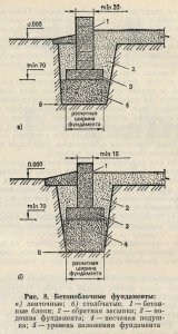 Бетонные монолитные фундаменты (рис. 6) выполняют на щебеночной или гравийной подушке (3). Бетон (1) укладывают в опалубку послойно. Каждый слой трамбуют ломом. Фундаменты из бетона годятся для всех типов зданий и на любых основаниях. Они экономичны, надежны, долговечны, особенно при армировании. Монолитный бетон применяют при устройстве ленточных, столбчатых и плитных фундаментов. До бетонирования тщательно выполняют подготовительные работы (разбивку осей, отрывку траншей, устройство опалубки, установку арматуры).