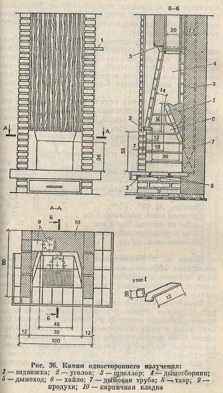 Камин одностороннего излучения. На рис. 36 приведены чертежи камина с односторонним излучением, используемого для отопления помещения объемом 90 м3. Как и все печи, он имеет отдельные дымоход и фундамент.
