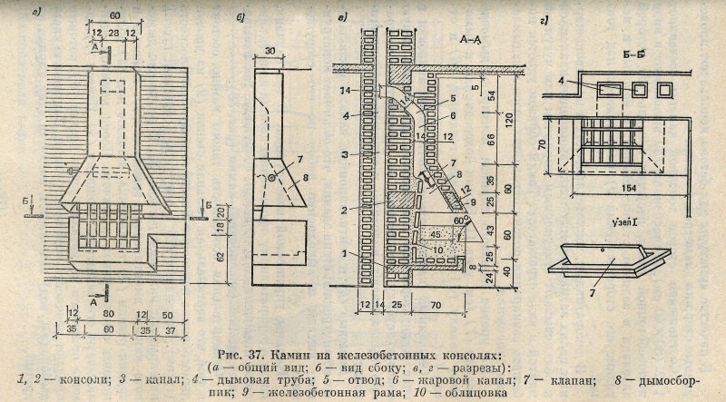 Камин одностороннего излучения, приведенный на рис. 37, может отопить в осенне-весенний сезон помещение площадью около 40 м2. Основной несущий элемент очага — нижняя железобетонная консоль (1) толщиной 8 см, задняя сторона которой закреплена в стене дымовой трубы (4). Размер сечения этой стороны 25 X 15 см.