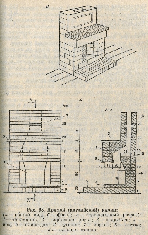 Камины упрощенной конструкции. В тех случаях, когда к декоративному оформлению камина не предъявляют повышенных требований, сооружают так называемый прямой (английский) камин (рис. 38).