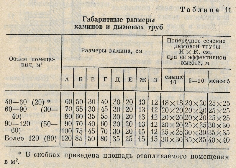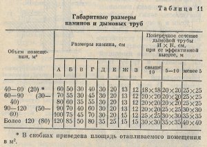 Габаритные размеры каминов и дымовых труб приведены в табл. 11, размеры топливника выбирают в зависимости от объема отапливаемого помещения.