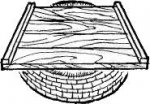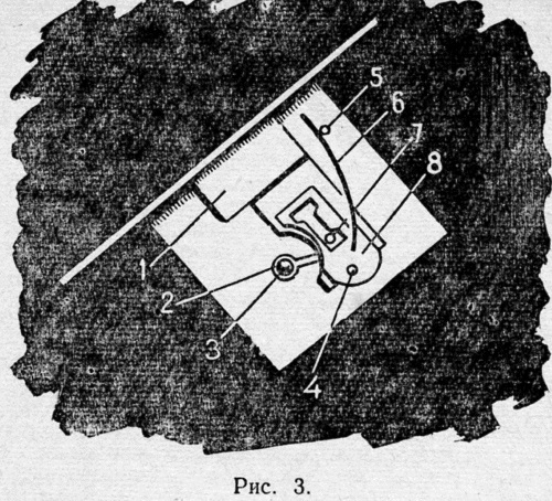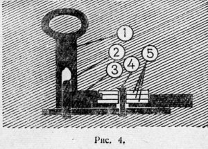 Схема замка показана на рисунке 3. Загнутая пластина, иногда прикрытая сверху другой пластиной, образует ящичек. На пластине или в ящичке монтируется весь замок. Язычок (1), кроме части, появляющейся из прорези, когда замок заперт, имеет еще скрытую внутри деталь в виде длинной пластинки с узким отверстием посредине. В отверстии свободно ходит шпенек (7), укрепленный на основной пластинке. На пластинке язычка слева есть выемка, в которую входит бородка ключа. Перед выемкой приклепан круглый шпенек (3), на который надевается ключ (2).