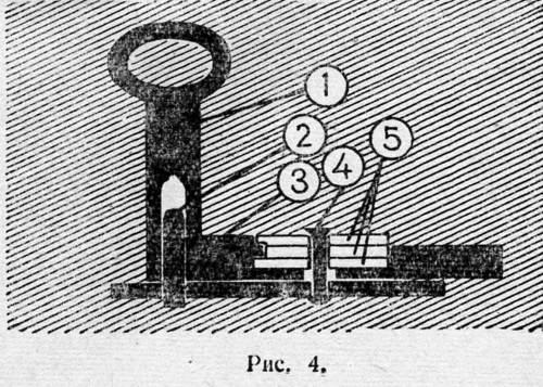 Чтобы после поворота ключа пластинки снова заняли свое место, каждая из них снабжена отдельной пружинкой (6), придерживаемой шпеньком (5).