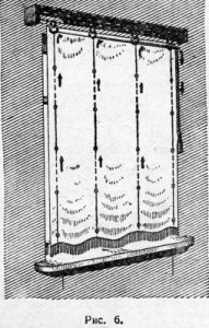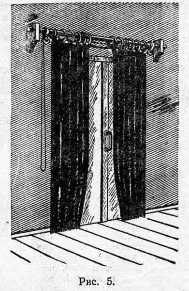Портьеры (раздвигающиеся занавеси) рекомендуется вешать на круглых деревянных палках, дюралевых трубах (рис. 5) либо на железных прутах (5—10 мм толщиной), прикрытых со стороны комнаты деревянными карнизами. К карнизу можно прибить наверху еще поперечное полотнище — ламбрекен. Длина шнура должна быть рассчитана так, чтобы при сдвинутых портьерах концы его можно было достать рукой. При раздвинутых портьерах концы шнура не должны лежать на полу. Чтобы шнуры не перекручивались, к их концам следует прикрепить небольшие деревянные или металлические грузики.