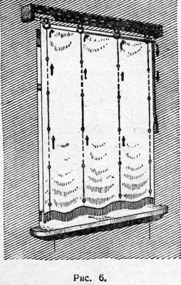 Устройство шторы и расположение шнуров, продетых в кольца, наглядно показаны на рисунке 6.