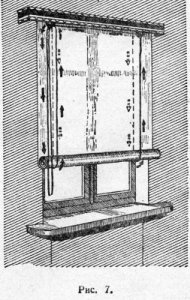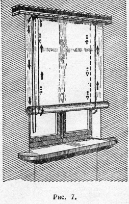 Такие шторки вешают не только для того, чтобы закрыть свет, но и для того, чтобы в жаркие летние дни предохранить комнату от излишнего нагревания, а в мороз оградить ее от холодного воздуха. При этом нередко делают ошибку, укрепляя занавеси на раме вплотную к окну. В этом случае они не приносят достаточной пользы, так как отсутствует слой воздуха, необходимый для теплоизоляции. Для того чтобы шторки не прилегали к раме вплотную, между планкой и рамой надо проложить небольшие деревянные чурбачки; если их под руками нет, можно использовать спичечные коробки, туго набив их бумагой или ватой. Вместо «соломенных» можно сделать такие же шторки из плотной материи или из ледерина и переплетного коленкора. Желательно в этом случае подобрать материал нужной ширины, чтобы обе боковые стороны оканчивались фабричной кромкой; обметывать закатывающиеся шторки нельзя.