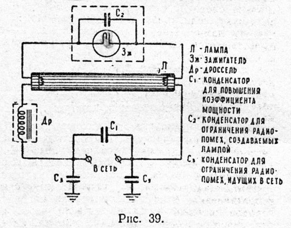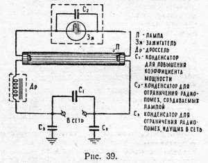 Нашей промышленностью выпускаются люминесцентные лампы на напряжение 127 вольт, мощностью 15 ватт и на напряжение 220 вольт, мощностью 30 ватт. Люминесцентные лампы включаются в осветительную сеть по различным схемам. Одной из лучших и наиболее распространенных является схема, приведенная на рисунке 39. В этой схеме применены конденсаторы для повышения коэффициента мощности (С1) а для подавления радиопомех зажигатель-стартёра (С2) и самой лампы (С3)
