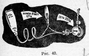 Если электроприбор рассчитан на 127 вольт, а напряжение в сети 220 вольт, то последовательно с прибором надо включить 127-иольтовую лампочку накаливания такой же мощности, какую имеет электроприбор. Например, мощность моторчика для швейной машины равна 50 ваттам. Значит, для последовательного соединения с моторчиком нужно взять 50-ваттную 127-вольто-вую лампу. Если мощность электропаяльника составляет 80 ватт, то последовательно с ним следует включить 127-вольтовую лампу такой же мощности. Так как 80-ваттных ламп не выпускается, надо взять ближайшую подходящую по мощности, в данном случае 75-ваттную. Разница в несколько ватт не скажется существенно на работе электроприбора. Для пользования 127-вольтовой электробритвой от сети с напряжением 220 вольт нужно последовательно с бритвой соединить 15-ваттную 127-вольтовую лампу.
