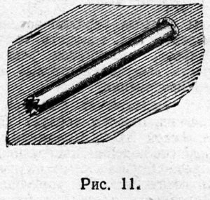Пробку с клином (рис. 12) вложить в отверстие и вбивать легкими ударами молотка. Когда клин дойдет до дна отверстия, он начнет постепенно распирать пробку в стороны; она пойдет туже, и ее нужно загонять сильными ударами молотка. Пробка, забитая по этому способу, держится очень прочно.