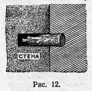 Через штукатурку шлямбур проходит очень легко, в кирпиче дело идет уже труднее, и удары молотком следует усилить. Изредка шлямбур надо вынимать из стены, чтобы вытряхнуть накопившиеся в нем крошки. Удары молотком должны быть резкими и быстрыми, молоток — не очень тяжелым. Глубина отверстия зависит от его назначения. Для пробки под большой гвоздь или средний костыль достаточно пробить стену на 6—8 см. Сделав при помощи шлямбура достаточно глубокое отверстие в стене, надо затем из сухого дерева (лучше из березы) выпилить прямослойный чурбачок, равный по длине глубине отверстия, и придать ему слегка коническую форму. Узкая часть должна свободно входить в отверстие, а широкая превышать его диаметр на 2—3 мм. Пробку надо вогнать молотком в отверстие, затем вбить в нее, как в обыкновенную деревянную стену, гвоздь или костыль.